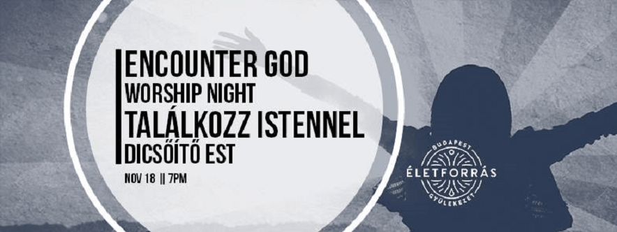 A „Találkozás Istennel” dicsőítő est, ahol Istennel találkozhatunk, és Jézussal kapcsolatos friss kijelentést kaphatunk az életünkre nézve. Ez idő alatt prófétai dicsőítést tűzdelünk meg prófétai üzenetekkel és imádságokkal. Az alkalom végén pedig azokért fogunk imádkozni, akik gyógyulásért kérnek imát. A dicsőítő est két nyelven zajlik (angol-magyar) és a belépés ingyenes.