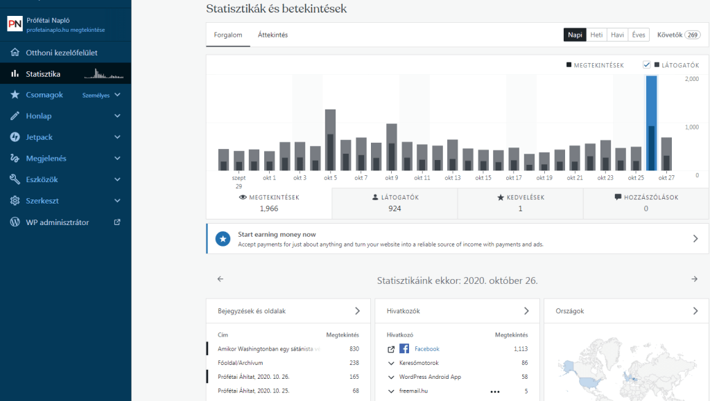 Tudjátok, ez egy olyan blog, amit tíz éve indítottam, főként napi próféciákkal, időnként színesebb tartalmakkal is, mint például a Sean Feucht vezetésével Amerika-szerte folyó dicsőítő alkalmakról szóló híradás. Konkrétan ezt a tegnapi cikket (2020.10.26-án lett publikálva) eddig közel ezerszer olvastátok el, ahogy a statisztika mutatja, csak tegnap több mint nyolcszáz kattintást kapott tőletek. Szuper!
